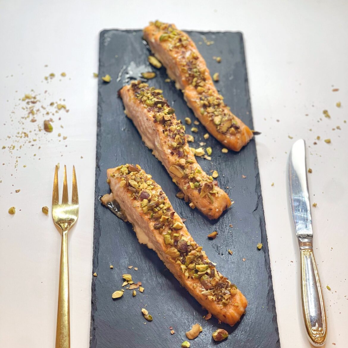 Losos operite, namažite premazom i stavite pistacije. Pecite na 200° 22 minute. To je to. Jednostavno a preukusno i malo drugačije.