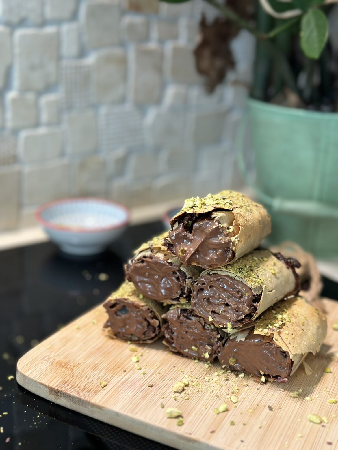 Na prvu koru namažite premaz. Preko stavite drugu koru i namažite krem koji ste držali u vrućoj vodi. Ja sam koristila onaj DM-ov Bio od lješnjaka. Pospete pistacije po kremu. Urolate i pečete na 210° dok ne porumeni. 2 minuta prije kraja premažete još jednom premazom. Kada izvadite iz rerne dodate još pistacija.
