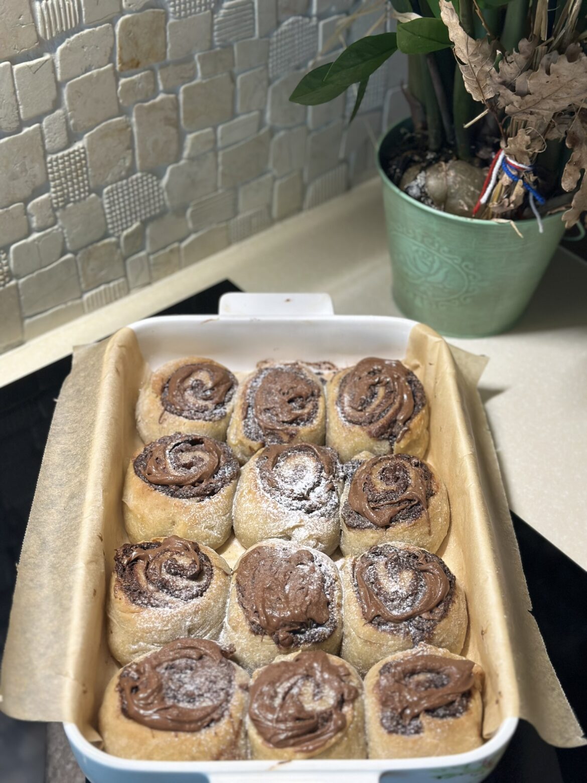 Razvući tijesto u pravougaonik i namazati krem pa posuti kapljicama čokolade. Urolati tijesto i isjeci na 12-14 jednakih dijelova i ostaviti da odmori 30-45 minuta. Peći na 180° nekih 30-45 minuta u zavisnosti od rerne.