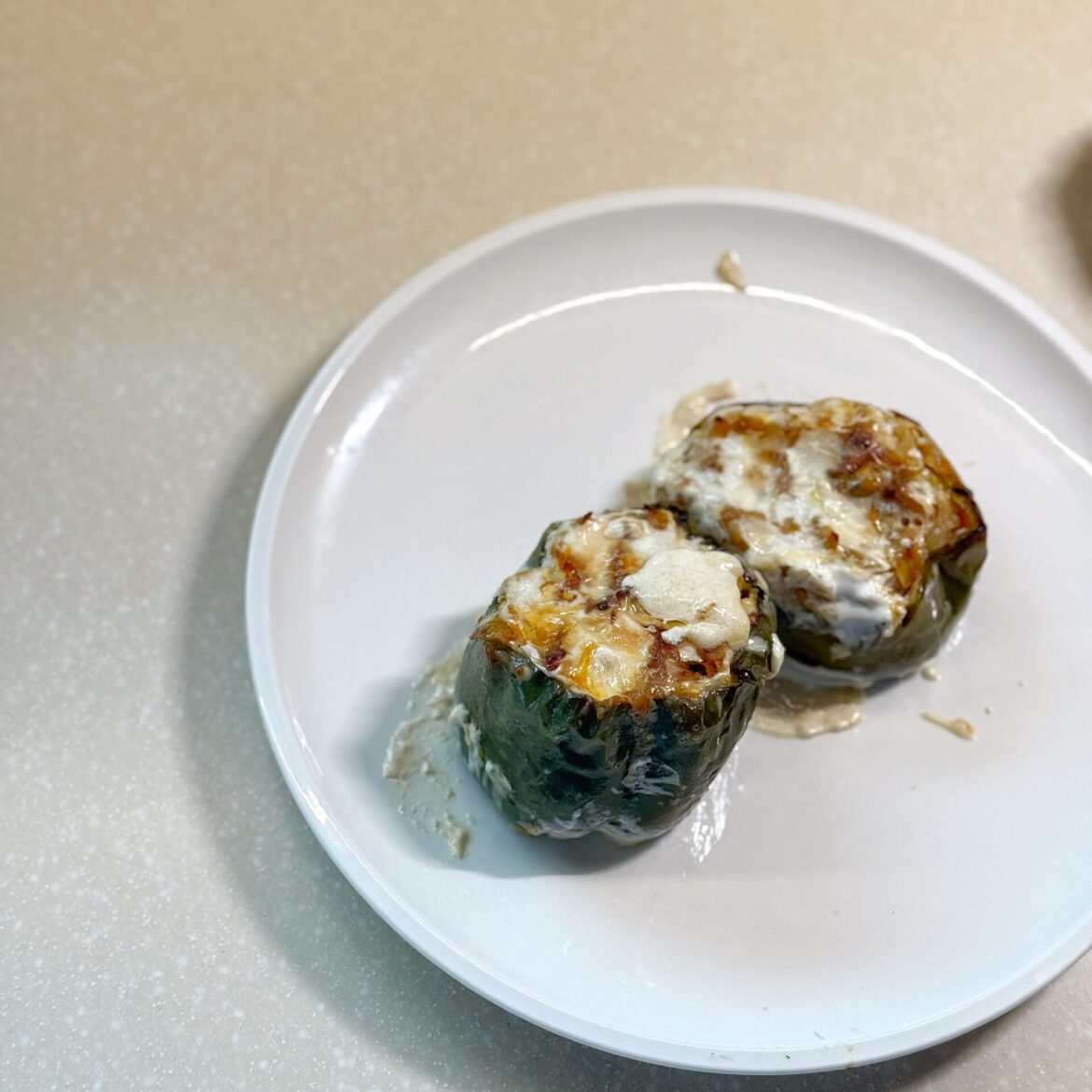 Luk nasječete sitno i dinstate 10 minuta. Krompir narendate. Sjedinite krompir i luk, sve začinite i napunite paprike. U rernu na 200° nekih 45-55 minuta. Potom zalijete sa vrhnjem i ostavite još 15-20 minuta. To je to, prijatnooo.