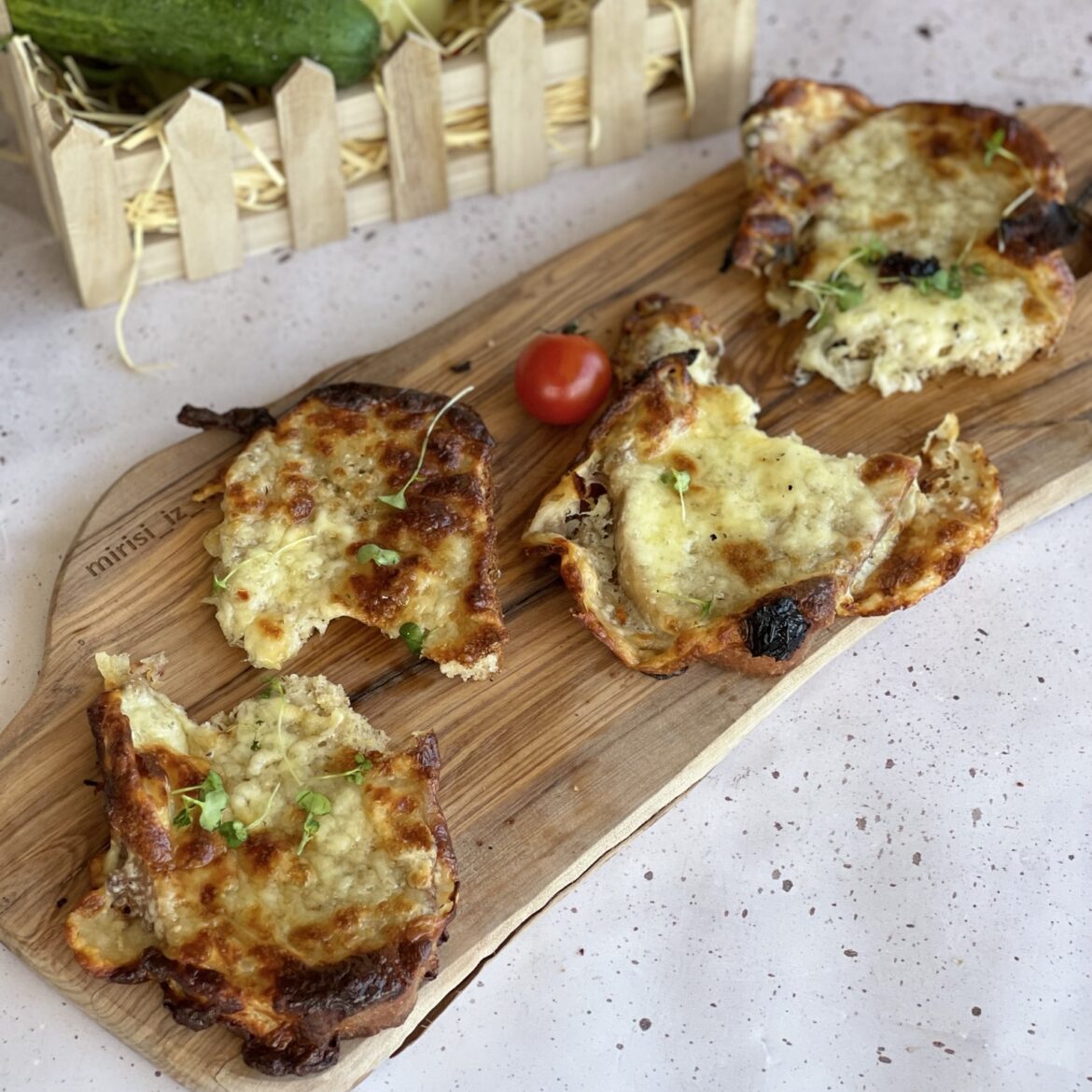 Namažite ulje na hljeb, pospite luk i stavite sir. Malo pospite sa maslinovim i zapecite na 250° dok ne porumeni.