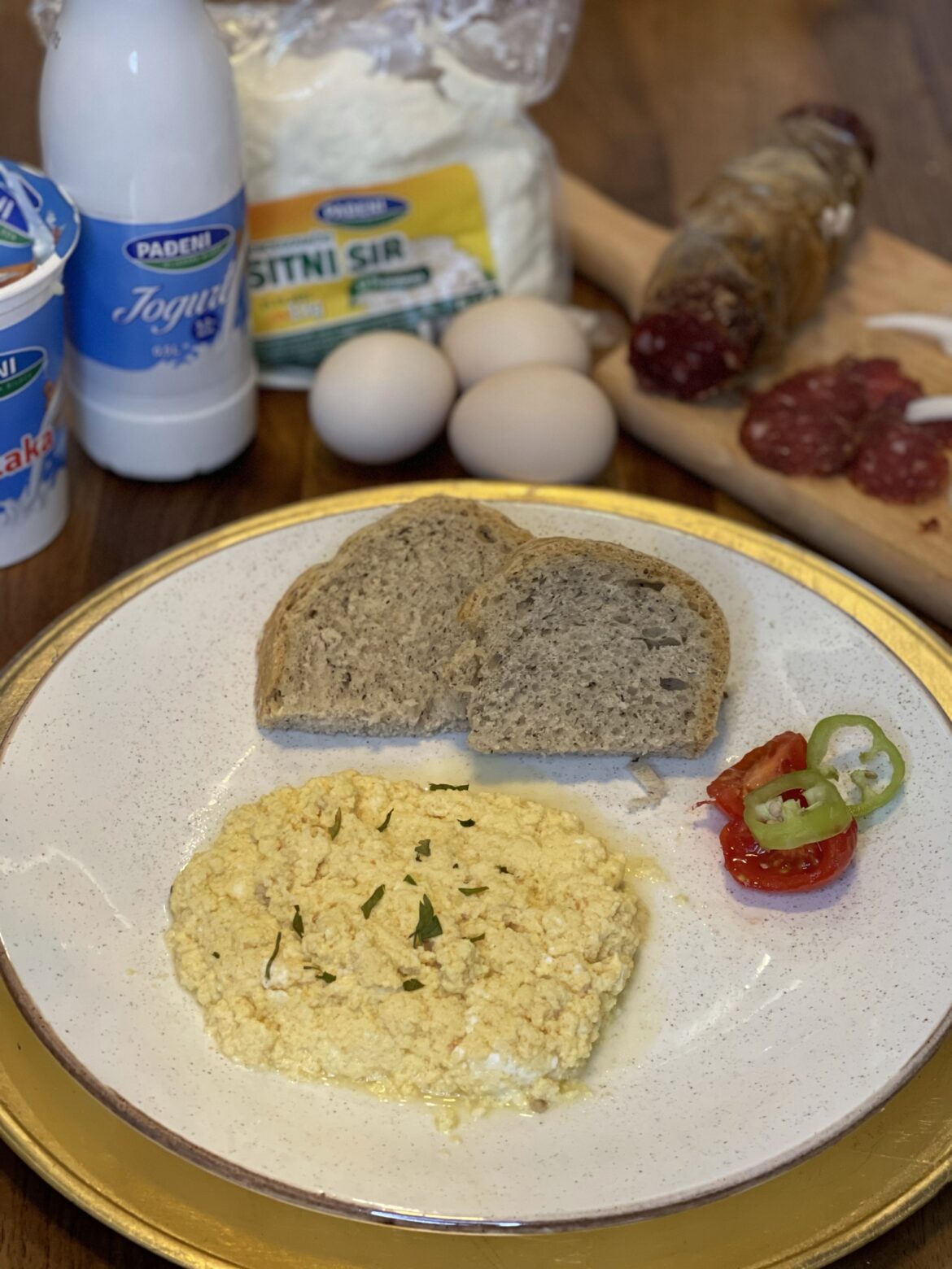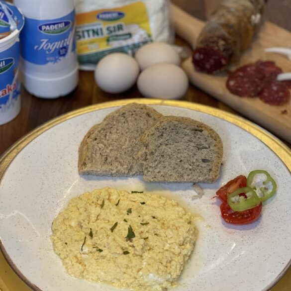Otopiti maslac u tavi, dodati sir i ostaviti samo 3 minute da se istopi malo. Jaja umutiti i dodati na smjesu od sira. Peći na tavi par minuta (ako volite tečnije pecite 4 minuta, a ako volite suvlje pecite malo duže).
