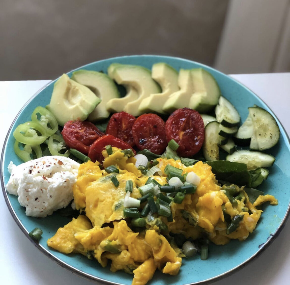 Jaje umutite sa pavlakom, mlijekom, soli, lukom bijelim u prahu i ispecite na ulju od sjemenki groždja. Rajčice prepolovite i ispecite po 4 minuta sa svake strane. Dodajte sira, povrća i uživajte.