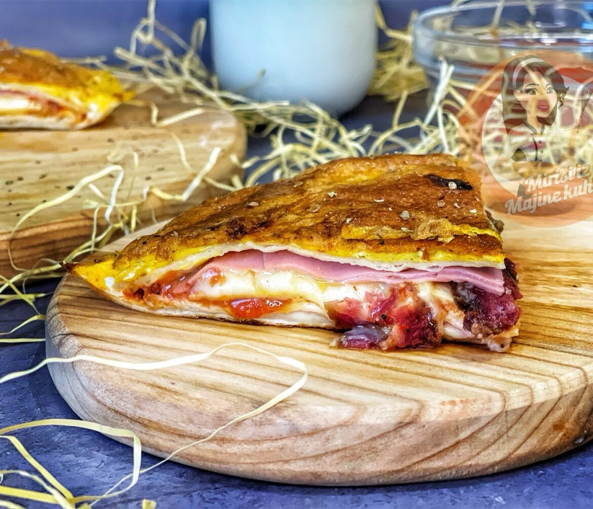 Jaje umutite i začinite po želji. Pola jajeta uspite u zagrijanu tavu sa masnoćom. Preko odmah stavite tortilju pa mortadelu, kulen i sir. Opet preko toga tortilja pa paradajz sos i sir, tortilja pa mortadela, kulen i sir, tortilja pa ostatak jajeta. Poklopite i na niskoj temperaturi pecite 4 min. okrenite i zapecite još 2-3 minute. Predlažem jogurt uz ovo jelo. Uživajte