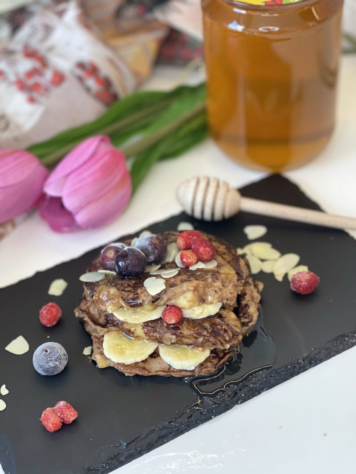 Prelila sam sa Agava sirupom i posula bademom. Izmdju svake palačinke izrendala sam malo jabuke i dodala par kolutova banane. Uživajte.