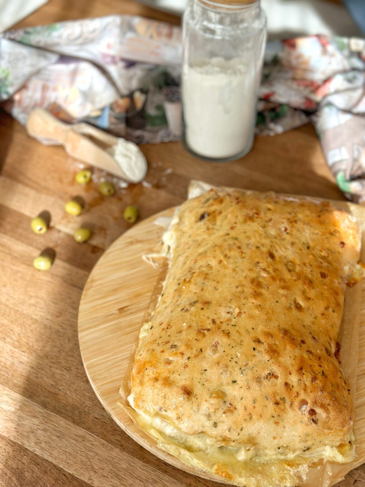 Ostavite sat vremena na toplom pa sat vremena u frižideru. Nakon toga razvucite tijesto, dodajte sir i složite kao na snimku. Pecite na 220° dok ne porumeni. Meni je trebalo oko 25 minuta. Premažite sa maslinovim uljem po želji