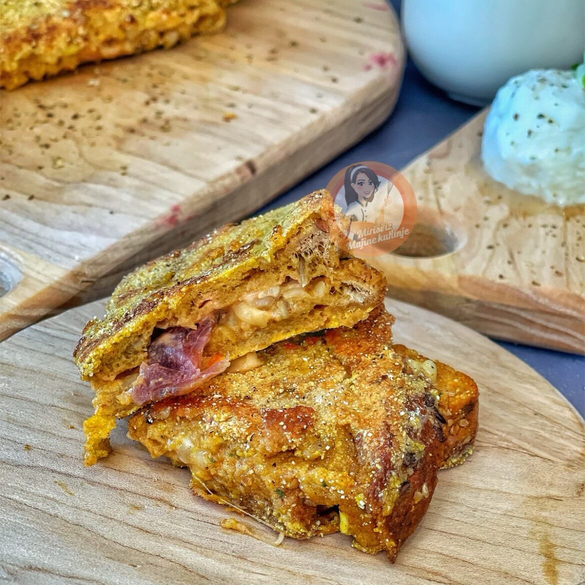 Jaje umutite, dodajte mlijeko, začine i ostavite minut, dva. Hljeb prvo namočite u jaje, namažite pavlakom i kečapom, dodajte nadjev, preklopite sa drugom šnjitom kao u videu i uvaljajte u miks brašna u koji ste stavili malo aleve paprike i soli.