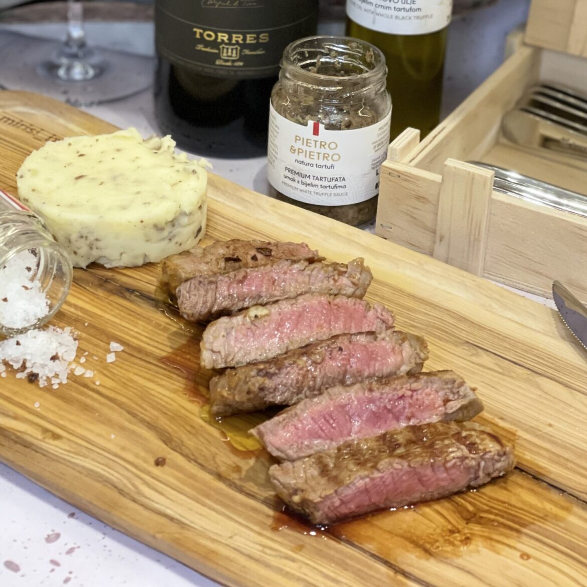 Biftek: Sve začinite i ostavite preko noći. Sutradan pecite na dobro ugrijanoj tavi. Možete peći po 4 minuta sa svake strane ili na svaka 2 minuta okrećite biftek i malo zasjecite nožem da vidite da li vam je ok pečen. Ja volim dobro pečen tako da kod mene to traje.
