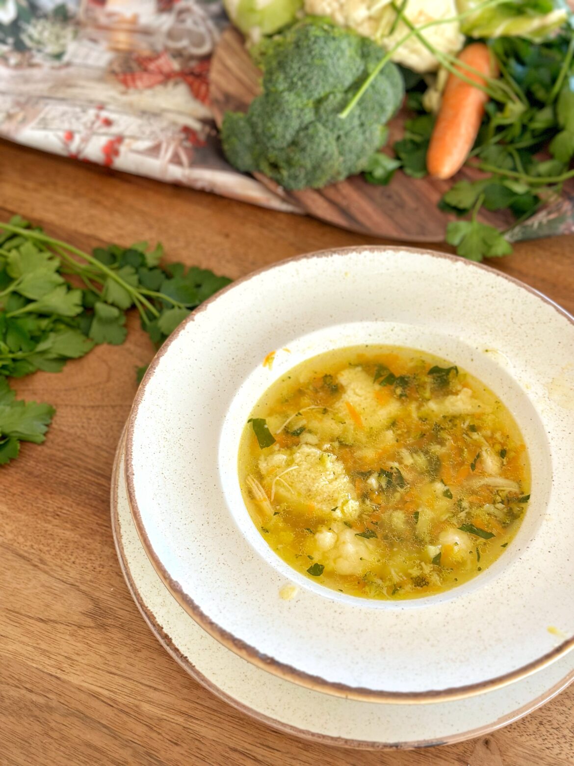 Pomješajte sastojke za knedle i ostavite 5 minuta da griz lijepo upije a za to vrijeme otvorite lonac, ubacite povrće i stavite da se povrće kuha 5 minuta. Takodje ovdje supu začinite. Nakon 5 minuta kuhanja povrća knedle dodajte malom kašikicom i kuhajte 5 minuta još sve zajedno. Pred kraj posolite i dodajte miks začina te peršin. Poklopite i ostavite 15-ak minuta da knedle narastu. Ovo su savrsene sočne i mekane knedle. Uživajte.