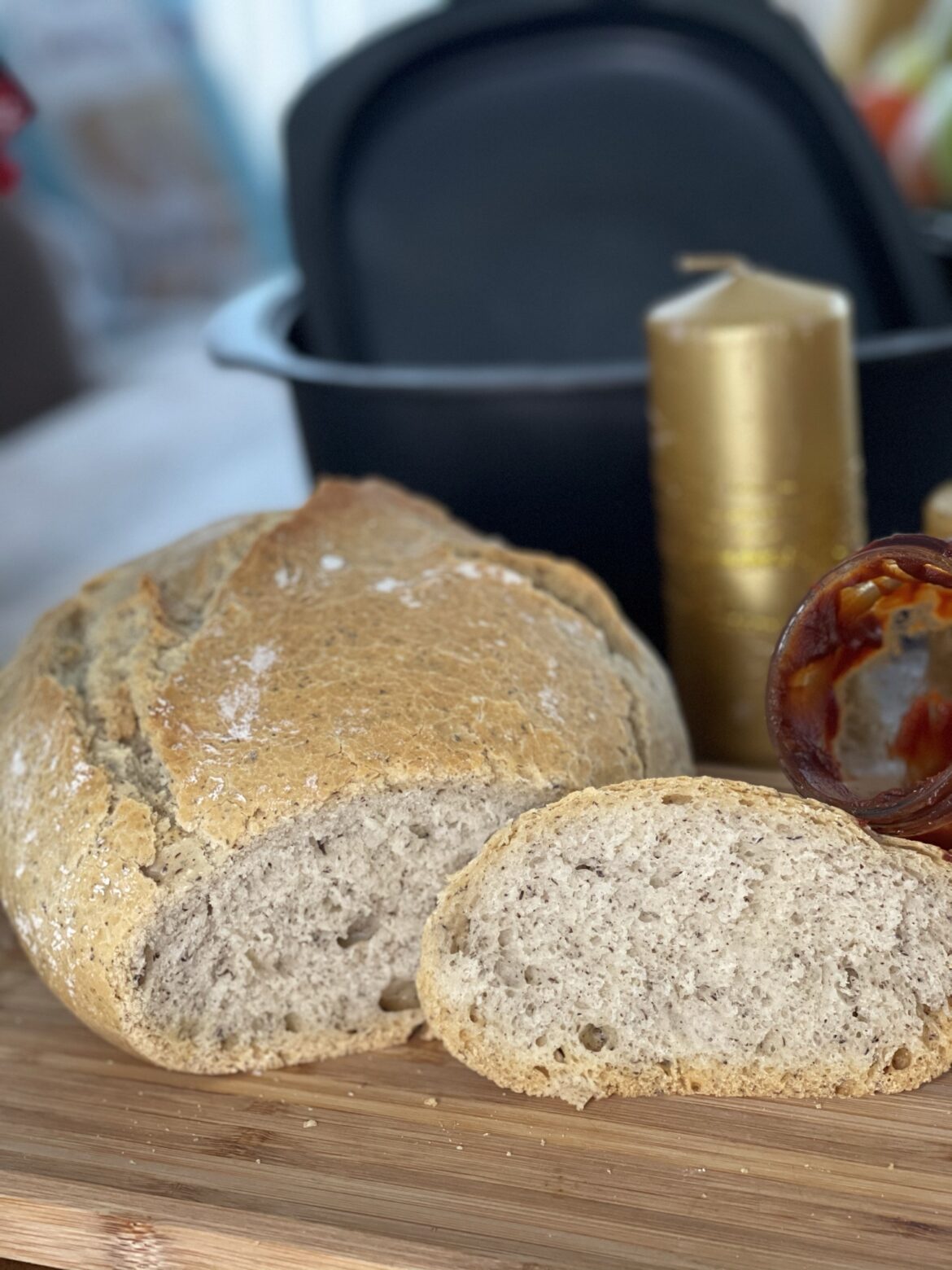 Stavite u posudu sve suhe sastojke, dodajte vlažne(dodajte prvo 300 ml vode pa još 20 ako je potrebno) i umjesite tijesto. Ostavite na toplom sat vremena. Premjesite i dodajte brašna ako treba da se ne lijepi. Stavite hljeb u tepsiju i namažite maslinovim uljem.