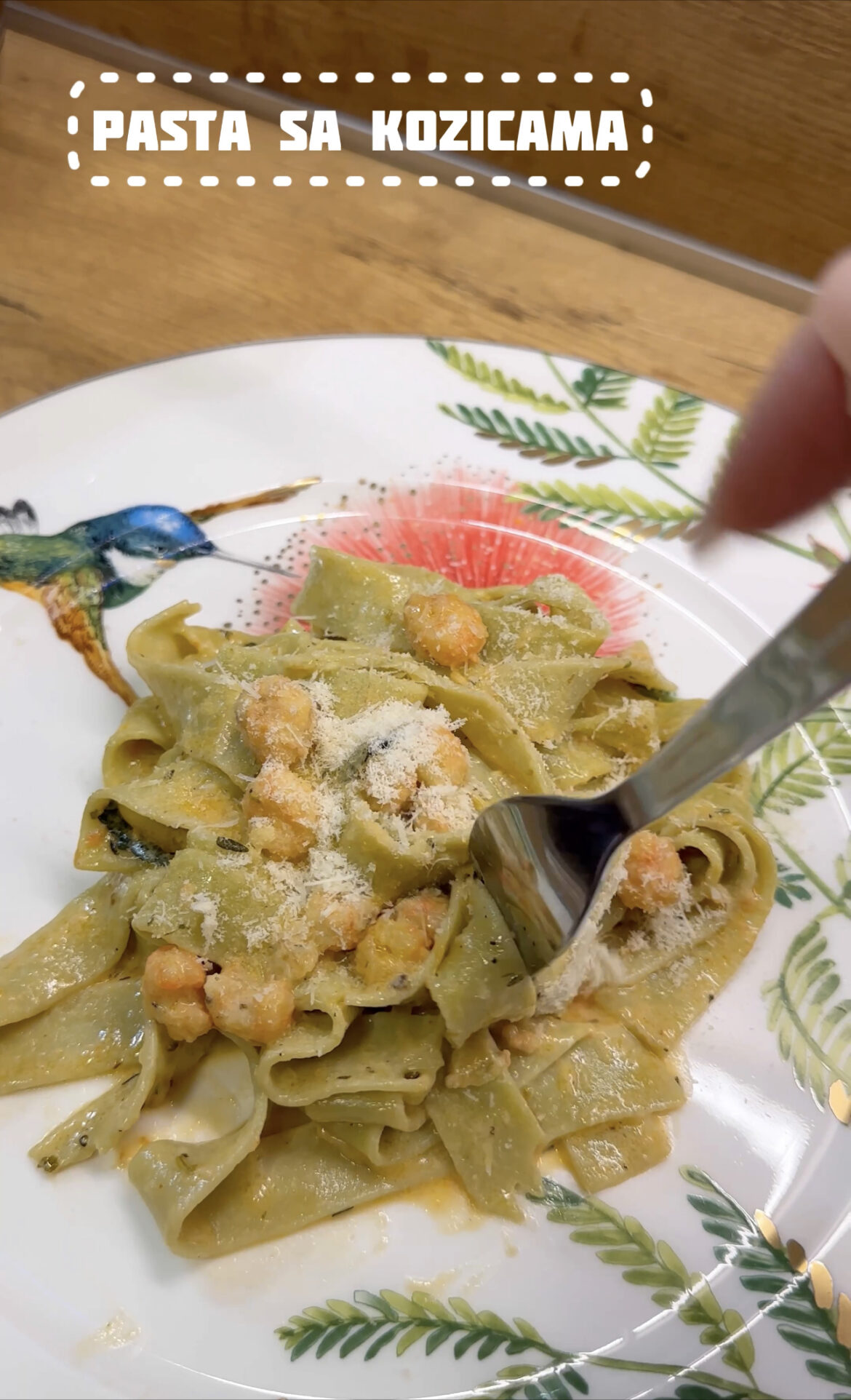 Stavite crveni luk na ulju da se dinsta. Nakon 10-ak minuta dodajte bijeli luk i peršin. Pet minuta nakon toga dodajte kozice. Dinstajte ih 15 minuta potom dodajte pelat, vrhnje, bujon(kocku što ste istopili u vodi), vino i pastu koju ste prethodno skuhali. Na kraju nasjecite malo sira i uživajte .