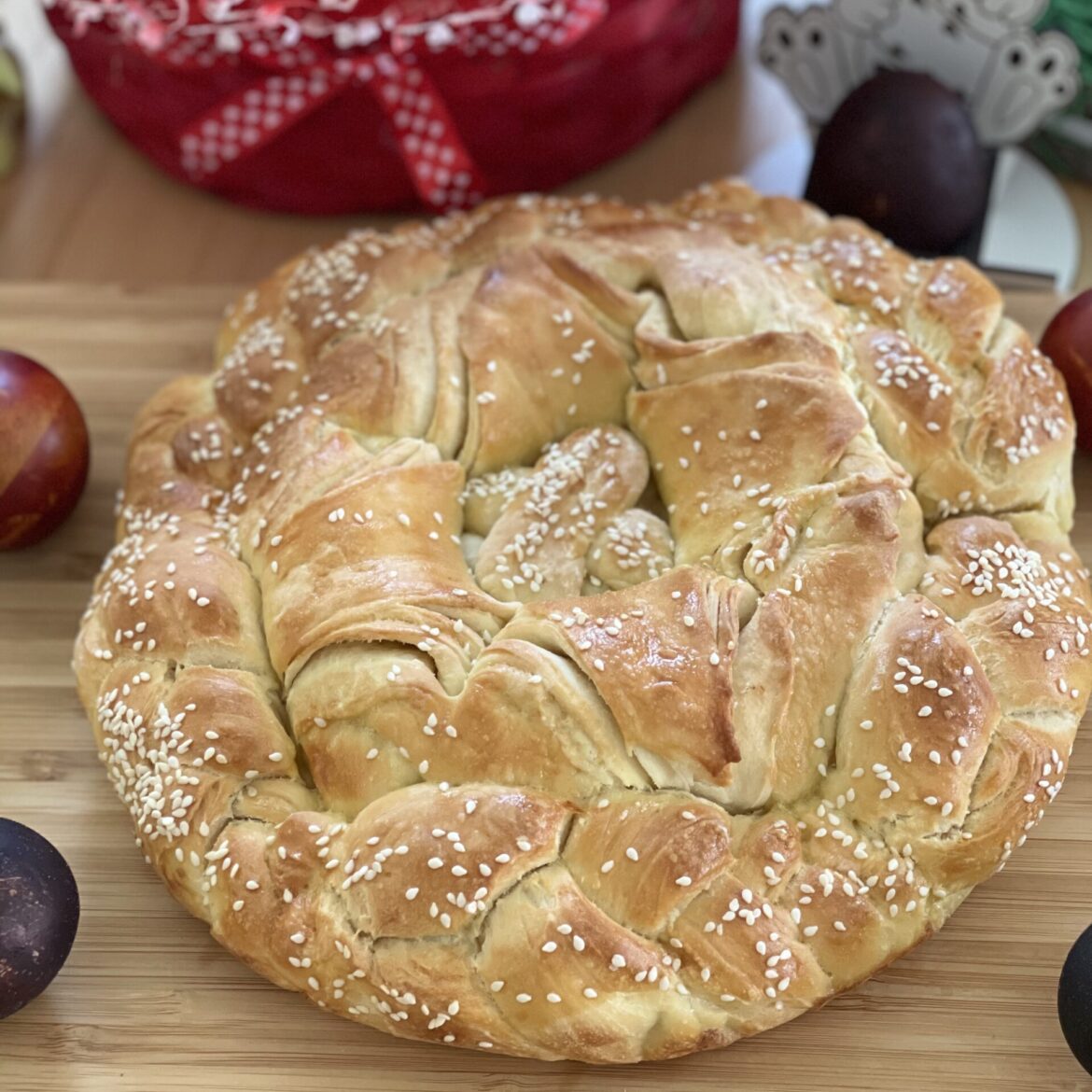 Ostale 4 loptice koristite za pletenicu. Uzmete jednu, podijelite na 3 kraka, namažete maslacem, uvijete pletenicu i stavite oko prvog dijela. Poslednju lopticu stavite u sredinu. Namažite jajetom, pospite susamom i pecite na 200° dok ne porumeni. Ovo je tako mekano, sočno, prste da poližete. Uživajte