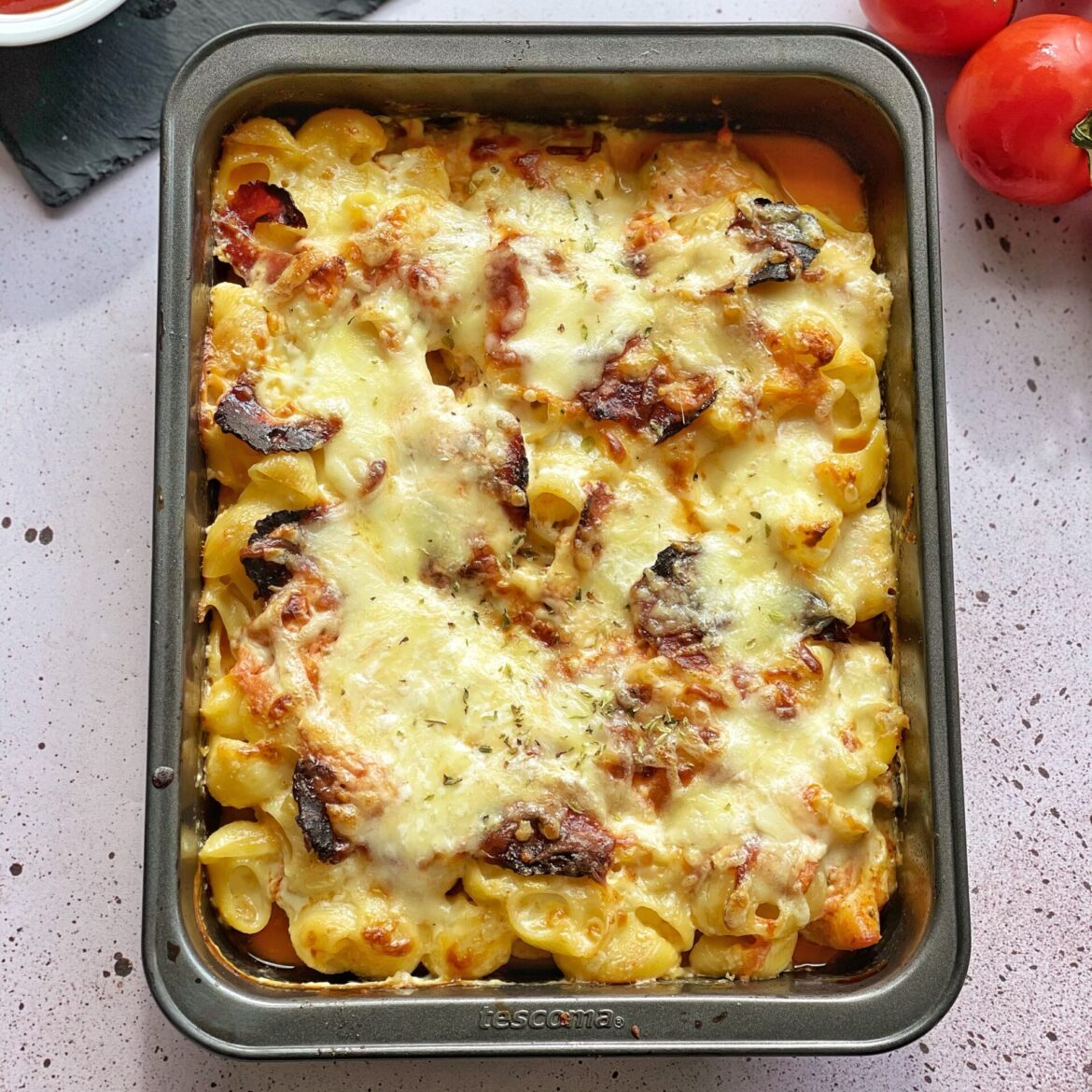 Na tepsiju stavite malo vrhnja, pa meso i makarone. Malo promješajte, stavite sira i zapecite na 200° dok se sir ne istopi. Kad je gotovo stavite origano da malo začinite ukus.