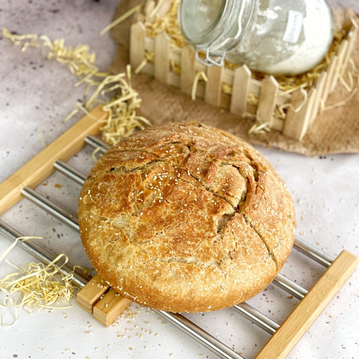 Pecite na 220° poklopljeno 28 minuta a nakon toga otvorite posudu i pecite još 24 minute. Ako nemate posudu sa poklopcem pecite oko 45-50 minuta. Ps hljeb treba biti baš tvrd i hrskav te žute boje kada je gotov a ako niste sigurni bocnite ga čačkalicom pa ako izadje suha gotov je. Ova minutaža je za moju rernu. Uživajte