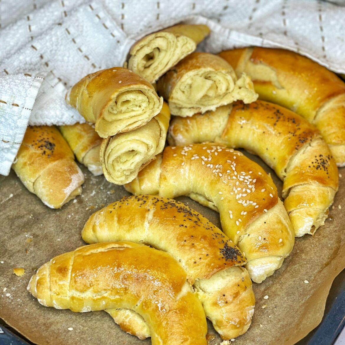 Tijesto premjesite, razvucite krajeve i napravite kuglice kao na snimku. Ostavite ih 10 minuta da odmore pa potom ih razvucite, premažite maslacem i pravite pletenice, kiflice, zemičke, hambije, šta god želite. Ostavite pokrivene 15-20 min.na toplom u plehu. Premažite jajetom, pospite sjemenkama i pecite na 200° dok ne porumene. Uživajte u najboljim kiflicama