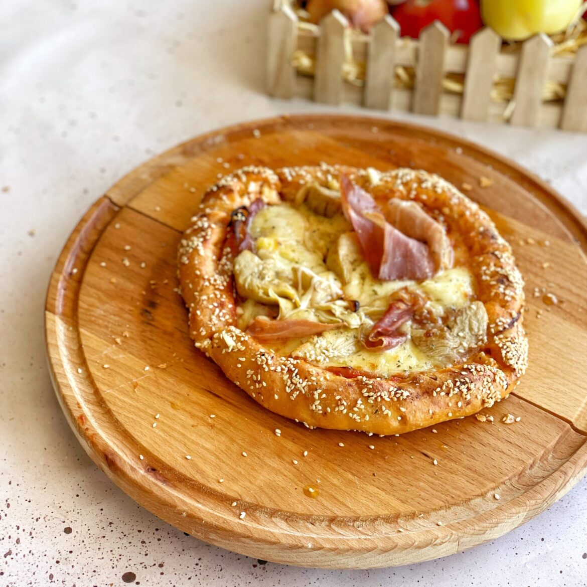 Razvucite tijesto oklagijom (cijelo na pleh ili manje pice kao ja na snimku), rubove napunite fetom, stavite pelat i nadjev. Poredajte mocarelu po pici. Rubove predjite namazom od bijelog luka i maslinovog ulja te pospite susamom.