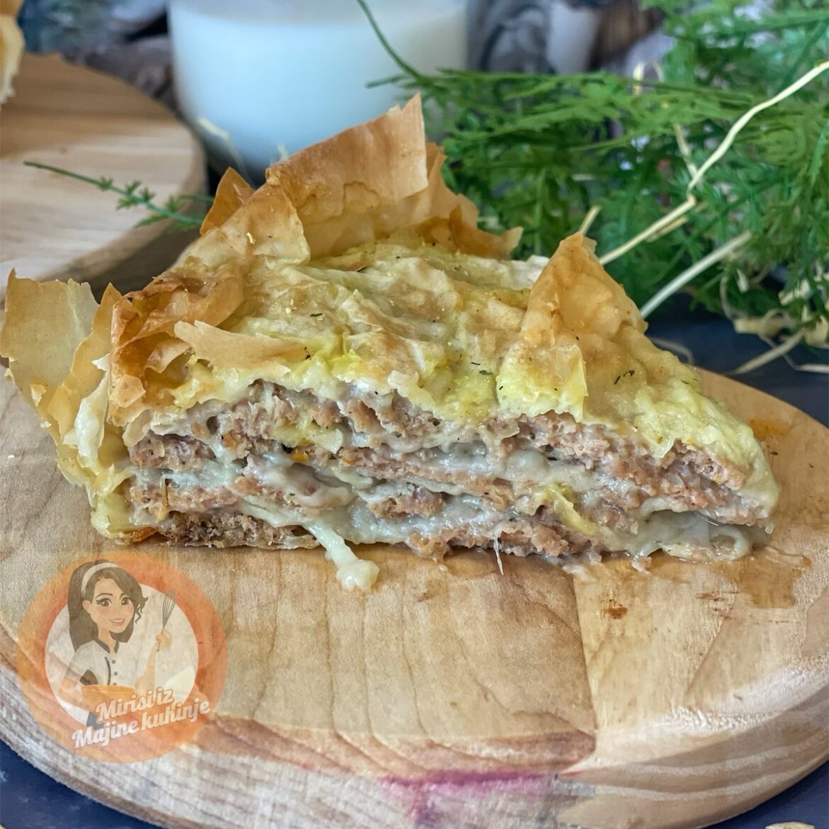 Tepsiju namažite maslacem i na dno stavite vrhove 3 kore (imate snimak pored) i premažite namazom. “Namažite” meso jer ja ga bukvalno mažem kao pekmez (snimak). Stavite preko koru pa premaz od ulja i kisele pa meso i tako sve do kraja. Vrhove kore dobro ušuškajte i ako su vam kore užasne kao ove moje stavite još jednu dodatnu preko. Poslednju koru ispricajte samo sa premazom. Pecite nekih 45-40 minuta. 5 minuta prije kraja prelijete sa vodom i začinom i zapecite. Uživajte
