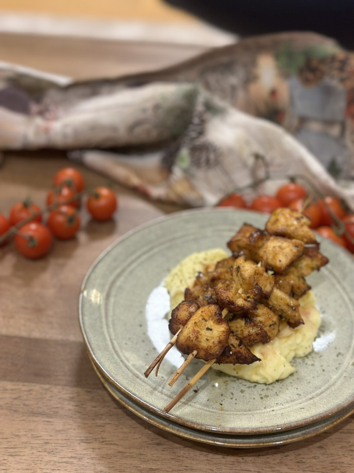 File nasjecite, dodajte sve začine, maslinovo i senf. Pecite u zagrijanoj fritezi po uputstvu. Meni je trebalo 12 min.na 200°. Izvadite, namažite istopljenim maslacem i bijelim lukom, vratite u fritezu na 30 sek. i to je to. Poslužite sa pireom