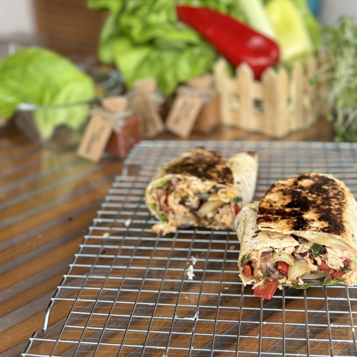Meso ispecite i izvadite iz tave. Na istoj masnoći ispržite paprike i luk da prelome. Grah i kukuruz zagrijete na taci samo par minuta. Na tortilju stavite namaz prvo pa piletinu, salatu, paprike i luk, sir, kukuruz i grah.
