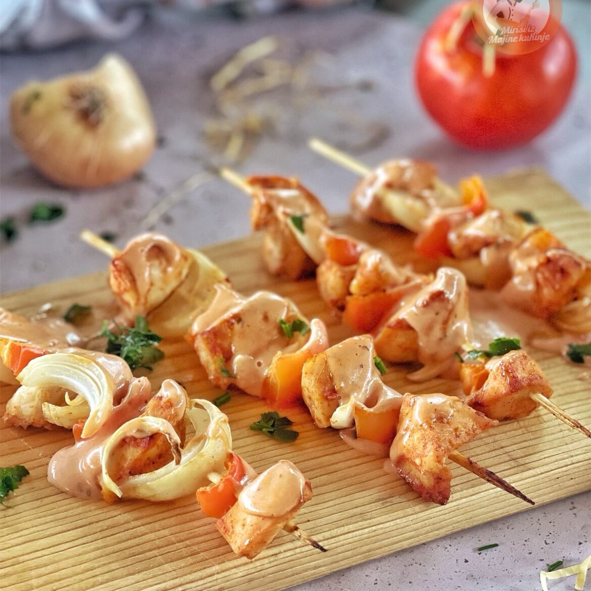 Piletinu isjeckajte na kockice, marinirajte, i stavite jedan komadić na čačkalicu, pa luk pa papriku. Sve stavite na pek papir i pecite na 200° nekih 20-30 minuta u zavisnosti od rerne. Ja sam na selu i slaba rerna pa je peklo 30 min. Prelijete sa sosom i uživajte