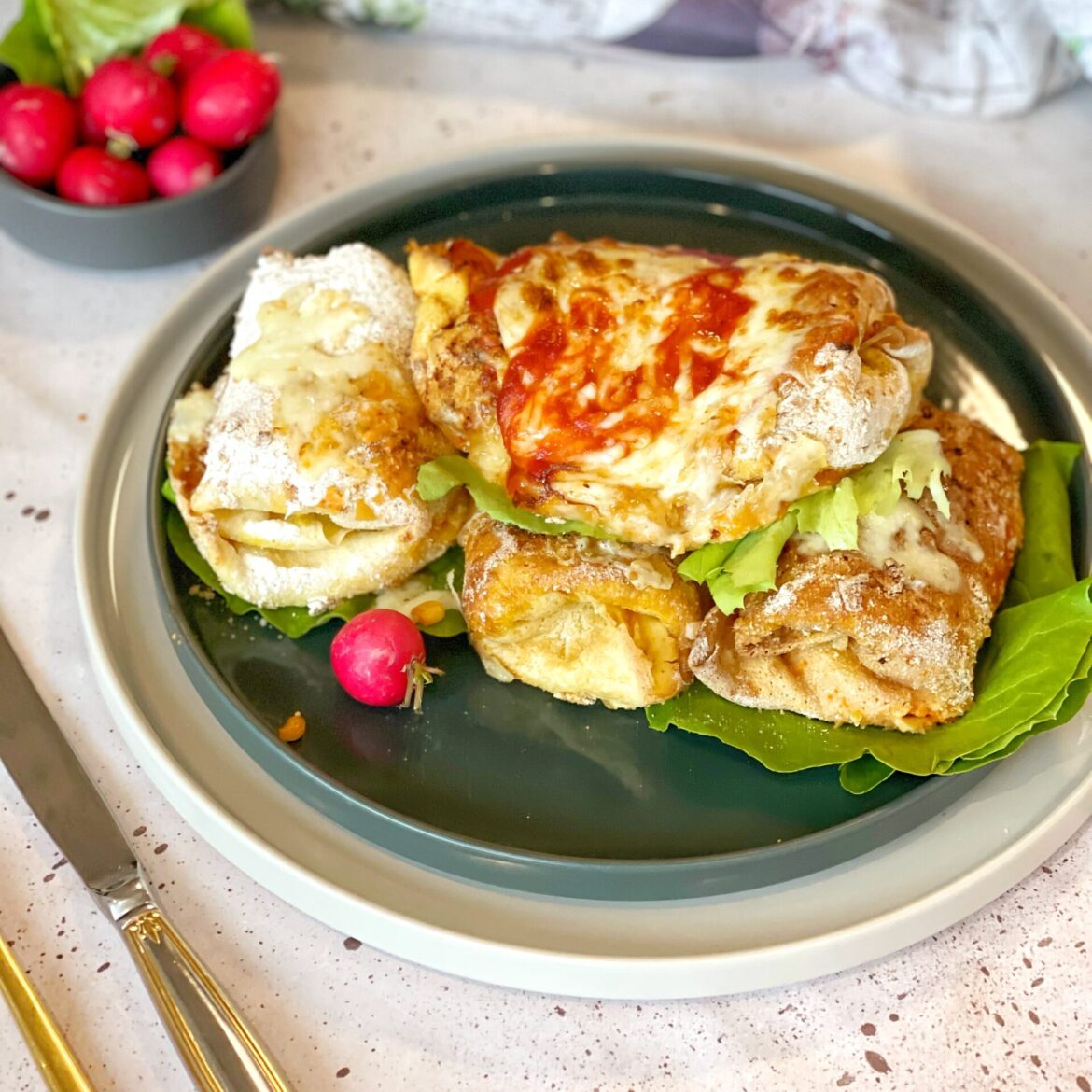 Na palačinku namažite pavlaku, crveni sušeni luk, piletinu i preko mocarelu. Urolate, stavite u jaje (ubacite začina u jaje), pa u brašno i prezle i stavite u fritezu na 10 minuta na 200°. Izvadite, stavite sir preko i zapecite još 3 minute. Uživajte