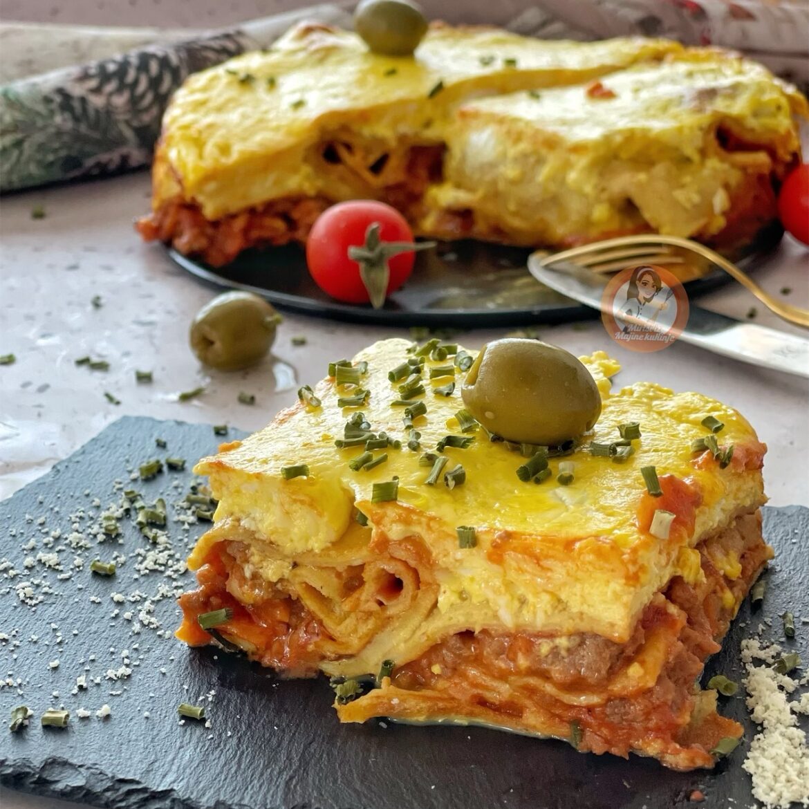 Punite palačinke i stavite u tepsiju. Ja stavila u onu okruglu od 20 cm. Prelijete sa prelivom (samo pomješajte sve za preliv u posebnoj posudi). Zapecite na 220° nekih 15-ak minuta. Uživajte i probajte ne ispeći nepce