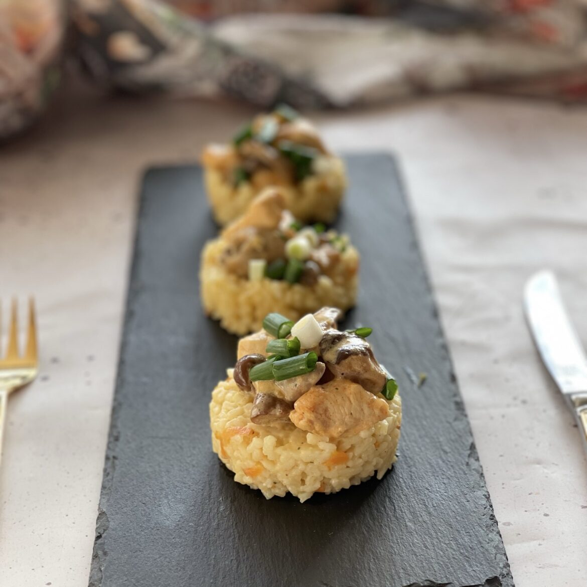 Piletinu nasjecite sitno, dinstajte nekih 15-ak minuta i začinite. Na luku prepržite gljive i pred kraj dodajte začine. Piletinu sjedinite sa gljivama i zalijete vrhnjem/bešamelom. Ostavite da krčka nekih 5 minuta. Uživajte