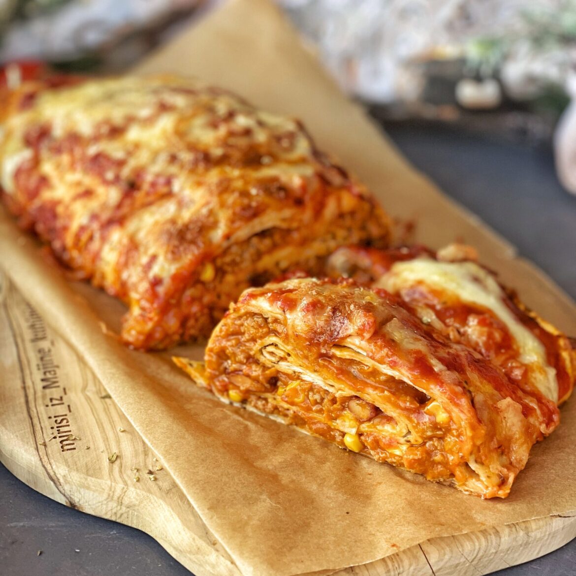 Tortilje poredajte kao na snimku, malo nauljite krajeve i stavite nadjev. Preko stavite malo mocarele, urolate i prelijete sa pelatom u koji ste stavili origano. Pospite sa mocarelom i zapecite na 220° nekih 20-ak minuta. Uživajte