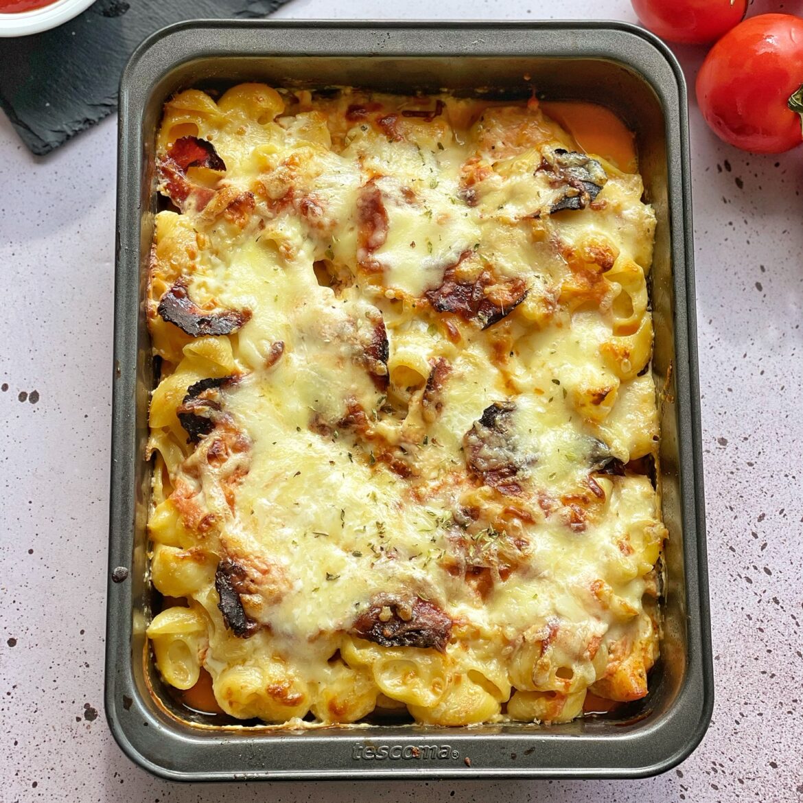 Stavite piletinu u nauljen pleh, preko miks pavlake i kečapa, pa onda stavite makarone i rasporedite ravnomjerno, pa opet stavite malo pavlake i kečapa, kulena i onda zalijte sa ostatkom vrhnja za kuhanje. Pospite sa malo mocarele. Pecite na 210° nekih pola sata i 5 minuta prije kraja dodajte svu mocarelu da se lijepo istopi. Uživajte u ovom divnom ručku