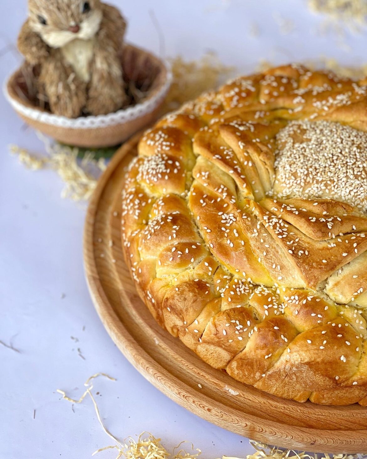 Stavite na pek papir i u tepsiju. Ostale loptice koristite za pletenicu. Uzmete jednu, podijelite na 3 kraka, namažete maslacem, uvijete pletenicu i stavite oko prvog dijela. Poslednju lopticu stavite u sredinu. Namažite jajetom, pospite susamom i ostavite u tepsiji pola sata. Nakon toga pecite na 200° dok ne porumeni. Ovo je tako mekano, sočno, prste da poližete. Uživajte.