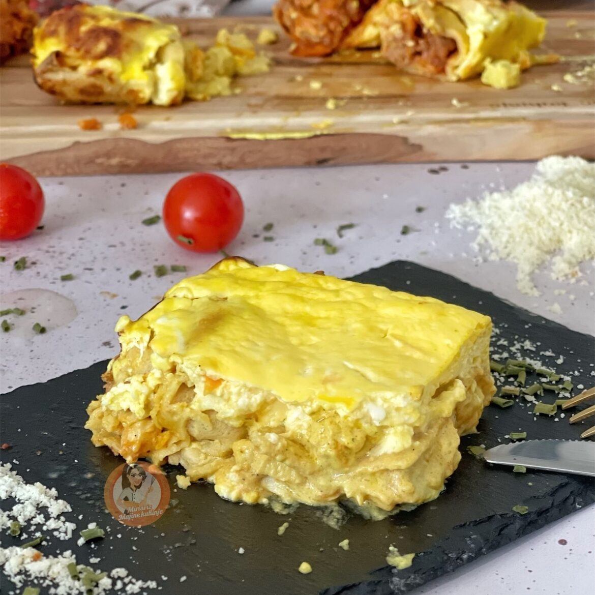Palačinku namažite sa pavlakom, stavite nadjev i urojalte. Ja sam i njih stavila u onaj okrugli kalup od 20 cm. Za preliv sve pomješajte i stavite preko. Zapecite 15-20 minuta na 200° ili dok se gore ne uhvati korica od sira. Uživajte