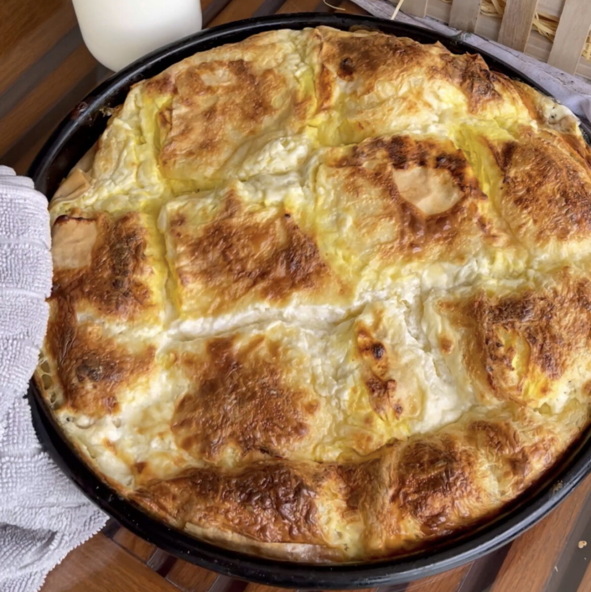 Dvije kore na vrhu mažete samo sa uljem i kiselom. Dobro ušuškajte pitu i nasjecite je na kocke. Prelijete sa vrhnjem za kuhanje i pečete na 220° dok ne porumeni (imate na snimku). 10 minuta prije kraja prelijete sa vrućim mlijekom (mora biti vruće jer na vruću pitu ide vruće mlijeko). Kada vidite da je pita upila mlijeko gotova je. Uživajte