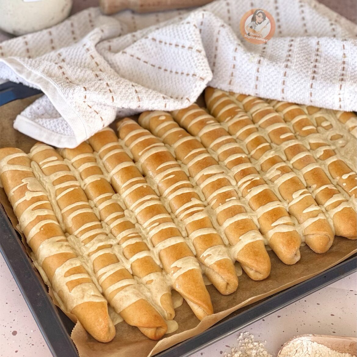 Izvadite tijesto i podijelite ga na 10-12 loptica. Ostavite loptice da odmore 15 minuta prekriveno folijom. Razvucite štapiće kao na fokti i uvijete samo kao rolat. Stavite ih na pleh, namažite sa malo ulja i ostavite da stoje još pola sata.