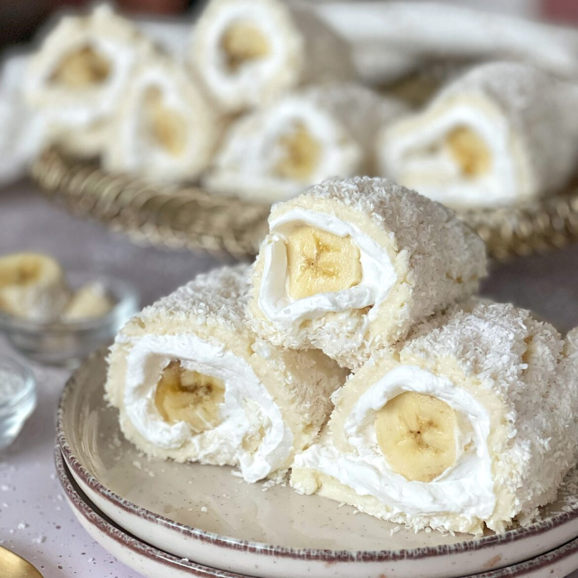 Umutite mikserom slatko vrhnje čvrsto. Nanesite na hladnu koru. Dodajte banane. Rasjecite po dužoj strani na jednake trake i urolajte (snimila sam vam video da vas ne zbuni to rolanje, na poslednjem slajdu je samo je u pitanju od prošlog paša lokuma da vas ne zbuni). Uživajte