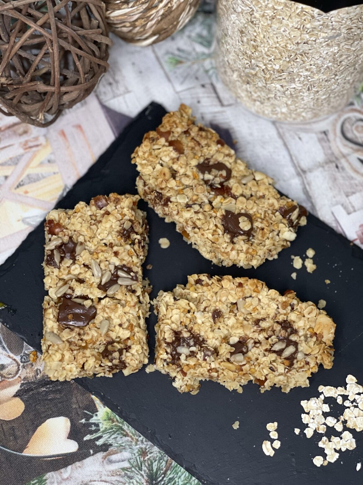 U loncu prokuhati puter, ulje, eritrol, med, so, narandžu i koru narandže. Sitno isjeckati datule i orase te pomješati ih sa sastojcima iz lonca. Dodati zobene pahuljice i dobro izmješati. Staviti na pek papir u pleh u rukama malo pritisnuti(imate igtv) i ubaciti čokolade po želji.