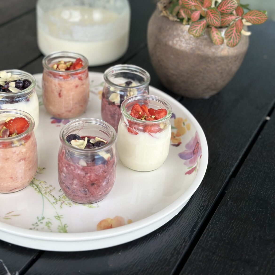 Mlijeko prokuhate i ostavite da se ohladi. Dodate kefir i ostavite u loncu (ili aparatu) 14 sati. Nakon toga dio voća izblendate, dodate 1,2 kašike jogurta i zasladjivača plus malo nasjeckanog voća. Ostavite u frižider i pojedite kroz par dana. Prijatno.