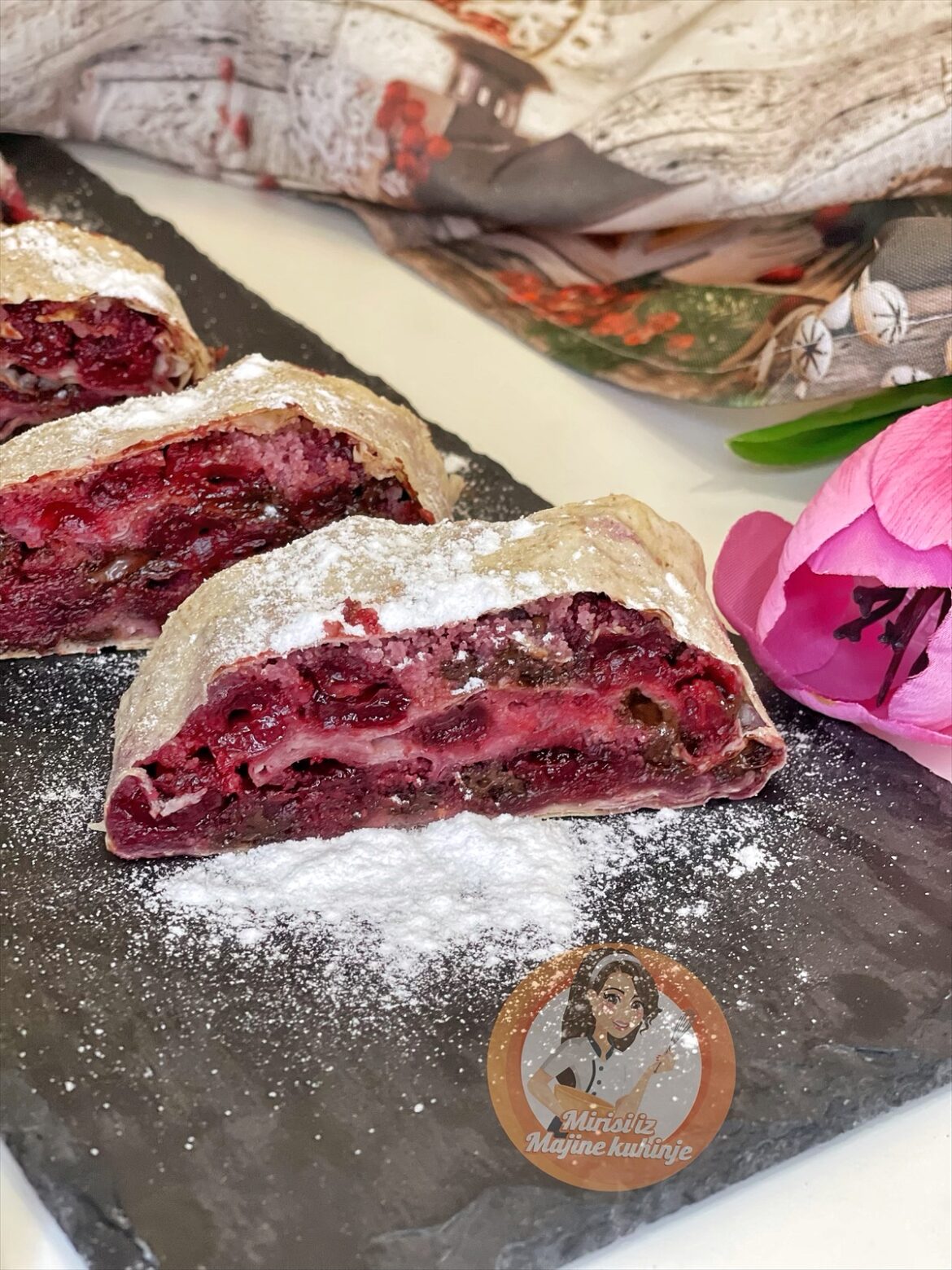 Savijete malo ćoškove prema unutra i urolate. Stavite u tepsiju i premažite uljem i vodom. Pecite na 180° nekih 45 minuta. Uživajte u ovoj ukusnoj bombi.