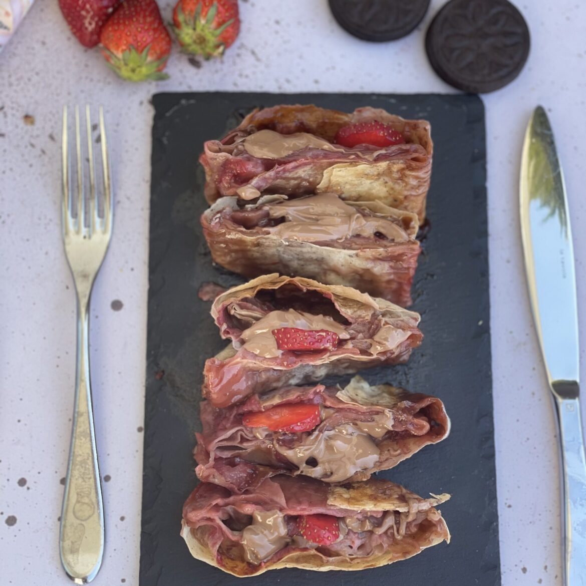 Koru malo naprskajte uljem. Savijete je kao na snimku. Stavite pekmez, jagode nasjeckane na kolutove, preko med i urolajte kao sarmice. Imate video na kraju niza. Stavite u rernu na 220° nekih 15-ak minuta.
