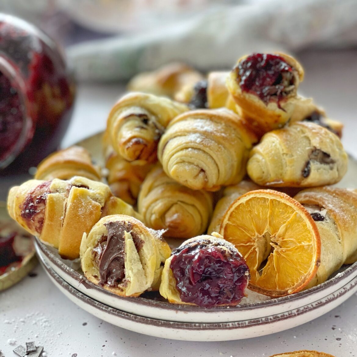 Ja sam ostavila preko noći da naraste tijesto. Vi ostavite dok se samo ne udvostruči. Potom podijelite tijesto na 9 malih jufkica. Razvucite jednu u krug pa namažite maslacem. Drugu razvucite i isto uradite i stavite preko. Treću ne premazujete. Četvrtu i petu opet mažete maslacem, šestu ostavite i onda 7,8 mažete i 9 ostavite suhu. Tako poredane jedne na drugu razvucite što tanje i rasjecite na osmine ili šesnaestine (po želji ako volite manje kiflice onda 16 dijelova a ako volite veće onda 8 dijelova).