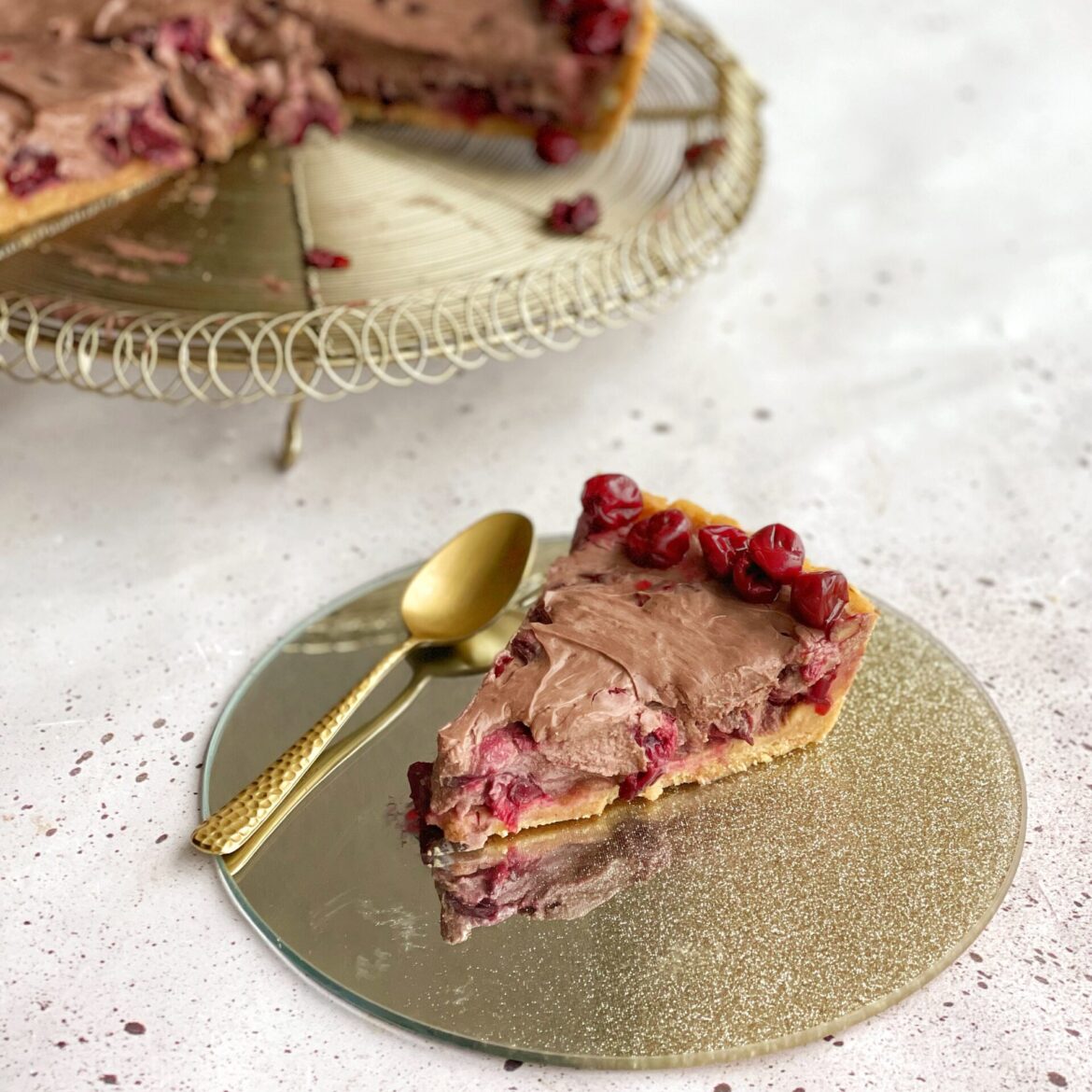 Izmiksajte maslac sa hladnim pudingom i ubacite višnje. Namažite preko podloge i ostavite 20-ak minuta do pola sata da se ohladi u frižideru. Uživajte.