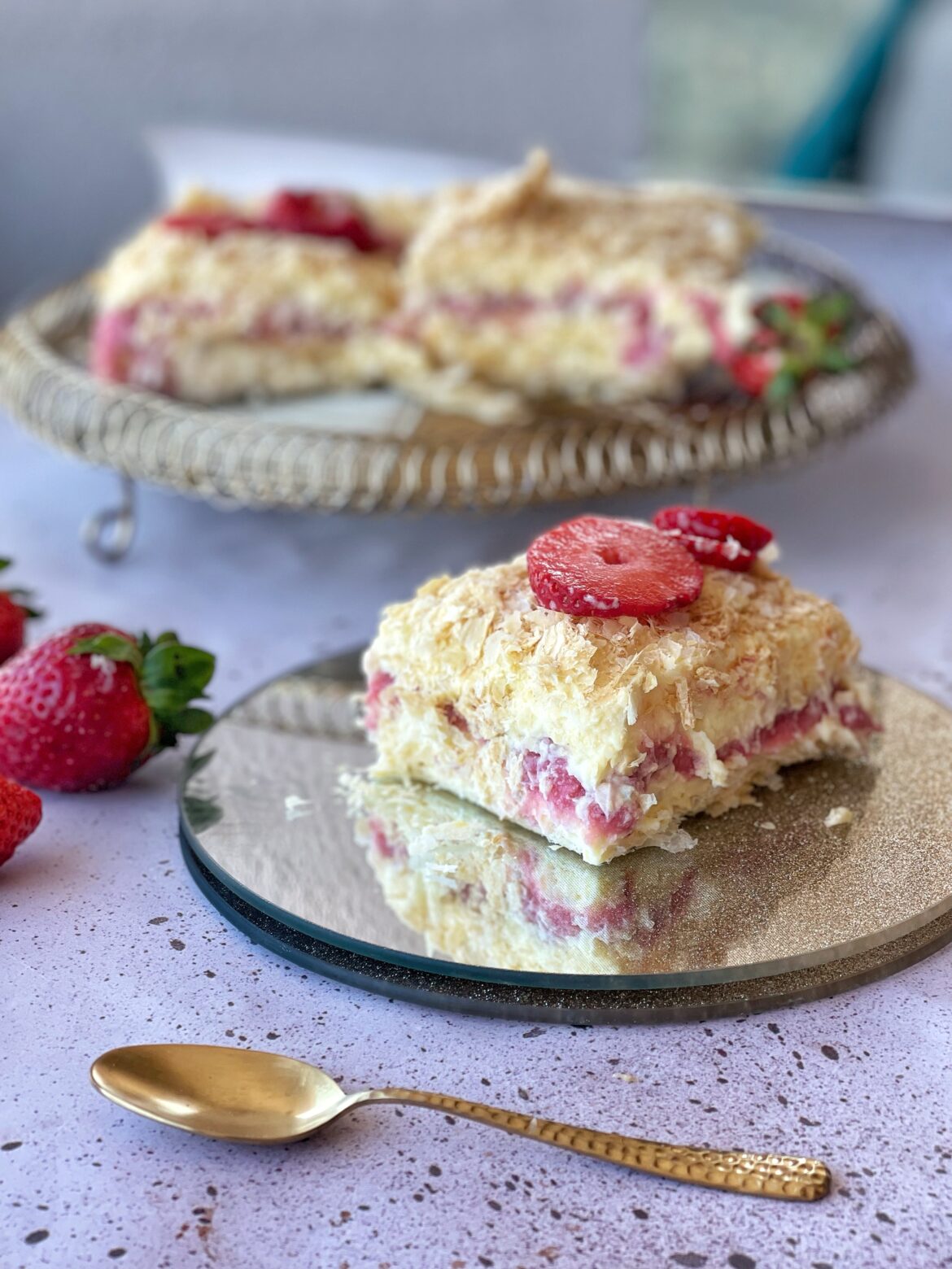 Jagode stavite da kuhaju sa šećerom i vodom 5 minuta, dodajte griz i kuhajte dok se ne napravi malo gušća masa (opet imate na reels-u). Ako je potrebno ubacite još malo griza da se zgusne ili vode da malo razrijedi (zavisi koji griz imate). Na ispečenu koru mažete bijeli krem, onda jagode pa opet bijeli krem i na kraju izmrvite lisnato tijesto preko. Ostavite da se dobro ohladi. Uživajte i zaista je prosto.