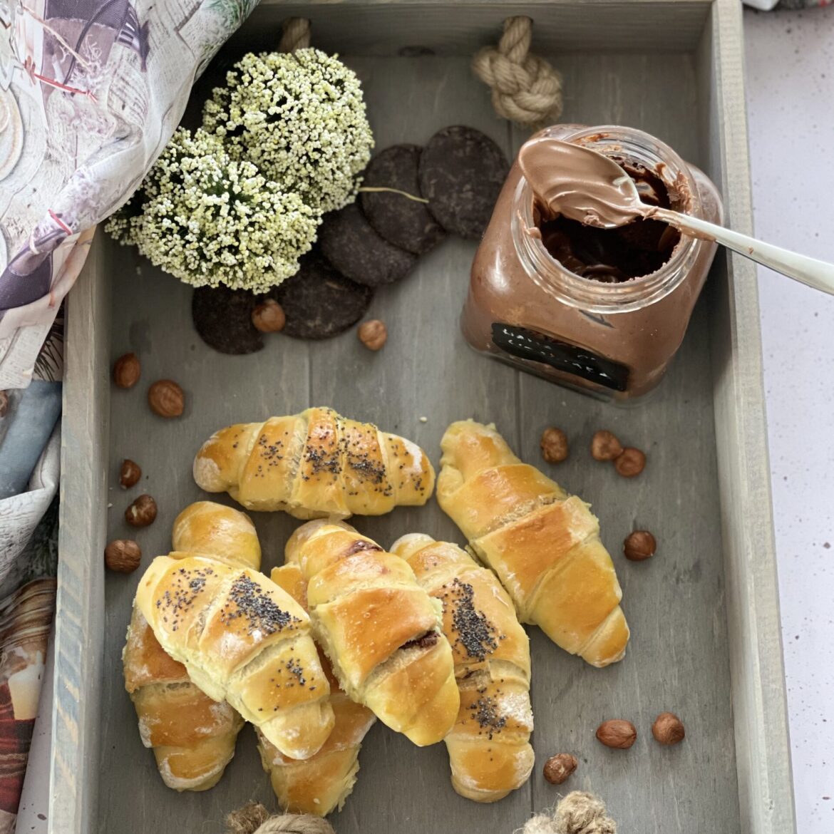 Tijesto podijelite na 6-7 loptica. Jednu razvucite u krug, namažite maslacem i ostavite sa strane. Sve ostale isto tako razvucite, namažite maslacem i redajte jednu na drugu. Poslednju ne mažete, ostavite suhu. Tako poredane prebacite ih na radnu površinu sa brašnom i razvucite u veliki krug. Podijelite krug na polovine, pa na cetvrtine, osmine pa lagano oblikujte kroasane (video ispod u postu sa praznim kroasanima). Namažite krem cijelom dužinom kifle obavezno, a ne onako da stavite samo na sredinu tačkicu, taj dio videa je na kraju. Premažite jajetom, pospite sjemenkama i pecite na 200° dok ne porumene. Uživajte