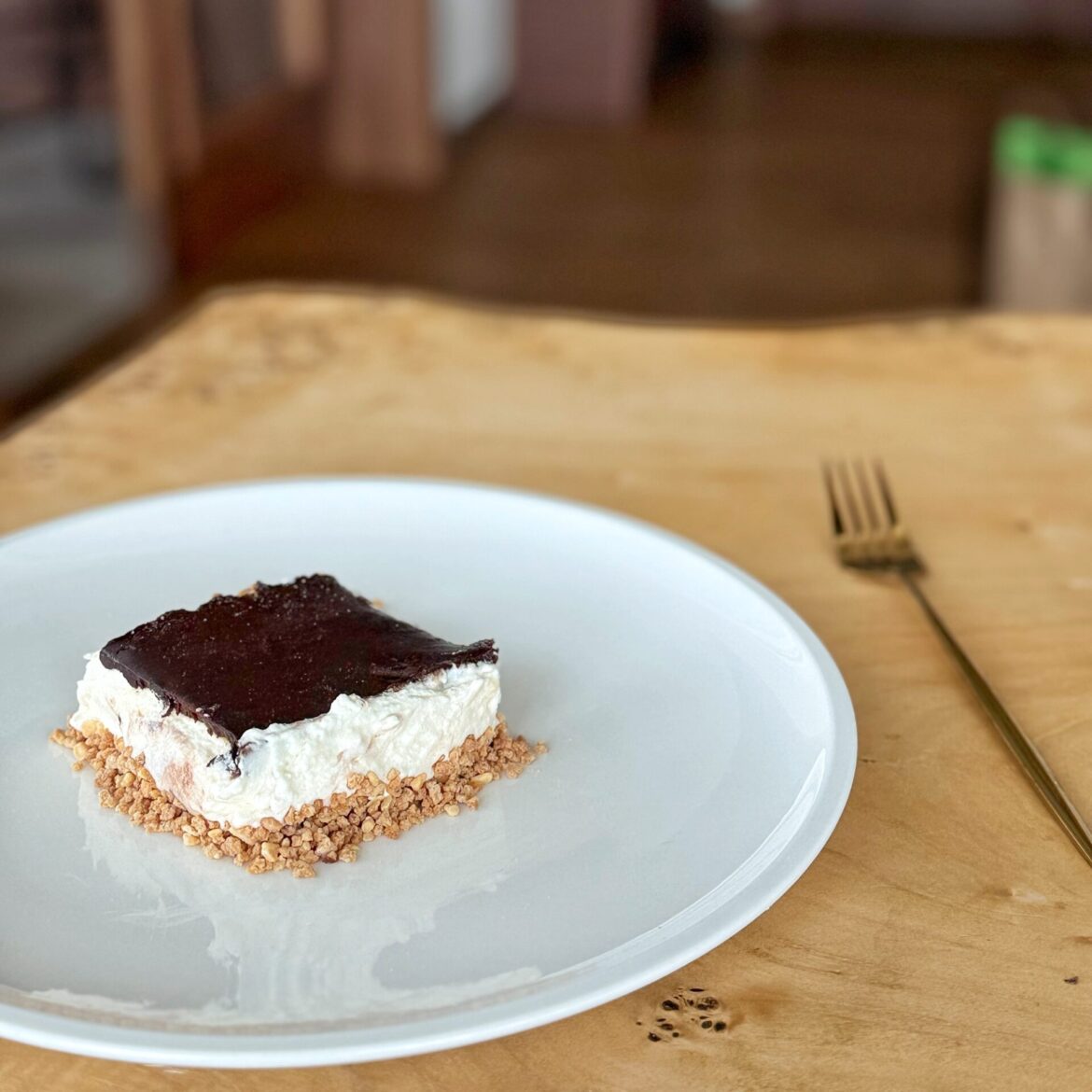 Istopite čokoladu u vrhnju i ne dozvolite da prokuha. Prelijete preko bijele kreme. Ja sam na kraju dodala na dno nasjeckane bademe a vi po želji.