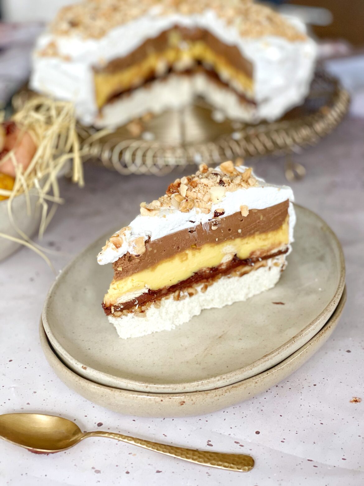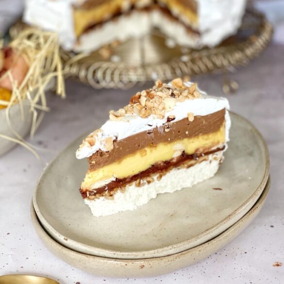 Kora: Bjelanjke dobro umutite. Dodajte šećer i brašno te mutite na najmanjoj brzini miksera 2 minuta. Stavite lješnjake koje ste usitnili (ako nemate pečene ispecite ih na 180° 12 minuta i skinite kožicu) u kalup na pek papir, dodajte smjesu od bjelanjaka preko i pecite 10-15 min.na 180° (u receptu piše 10 a meni trebalo 15, imate izgled kore na snimku).