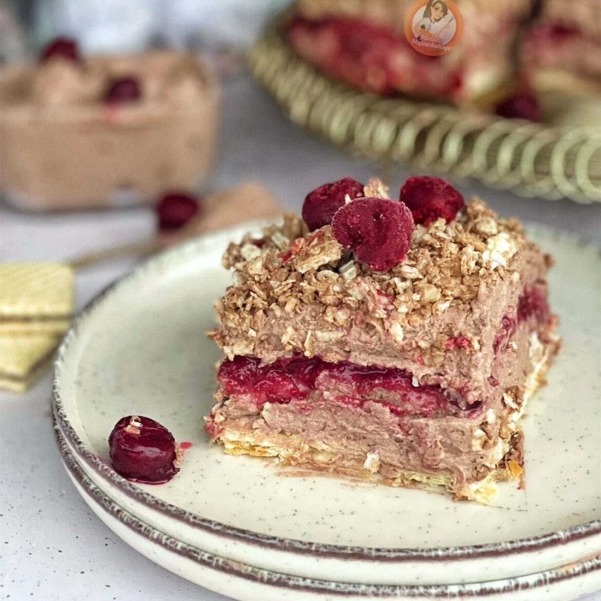 Na ispečenu koru mažete crni krem, onda višnje pa opet crni krem i na kraju izmrvite 4 napolitanke preko. Ostavite da se dobro ohladi. Uživajte i zaista je prosto