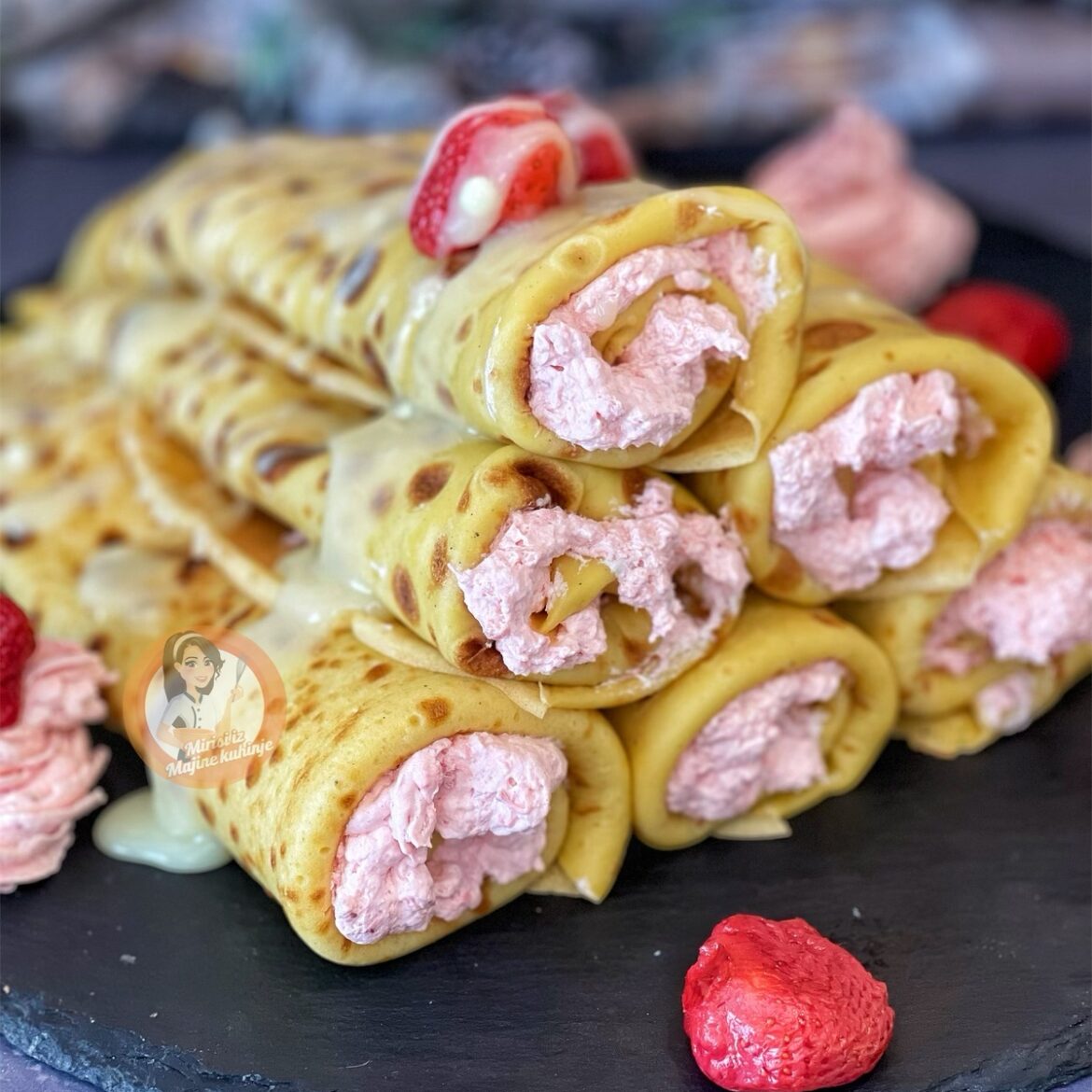 Krema: Prvo mutite sir ili vrhnje slatko i kada dobro umutite dodajte jagode i eritrol. Punite palačinke i umotajte. Toplu čokoladu istopite sa 6 kašika slatkog vrhnja. Dobro promješajte i prelijete preko palačinaka. Uživajte
