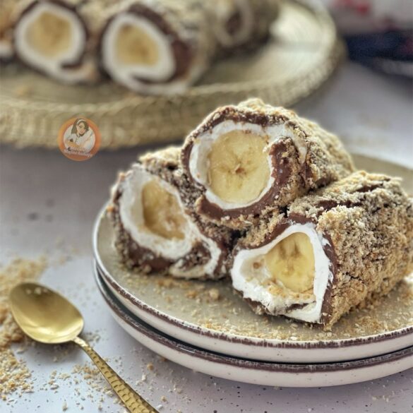 Umutite mikserom slatko vrhnje čvrsto. Nanesite na hladnu koru i stavite 1/2 banane. Rasjecite po dužoj strani na jednake trake i urolajte. Uživajte