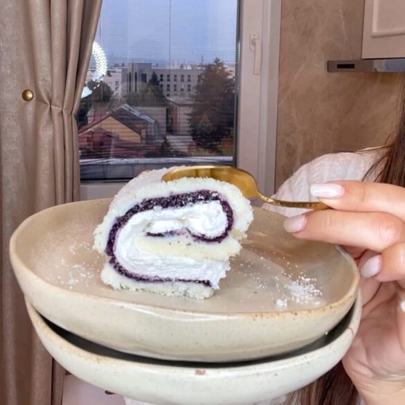 Umutite mikserom slatko vrhnje čvrsto. Nanesite na hladnu kremu. Rasjecite po dužoj strani na jednake trake i urolajte. Uživajte