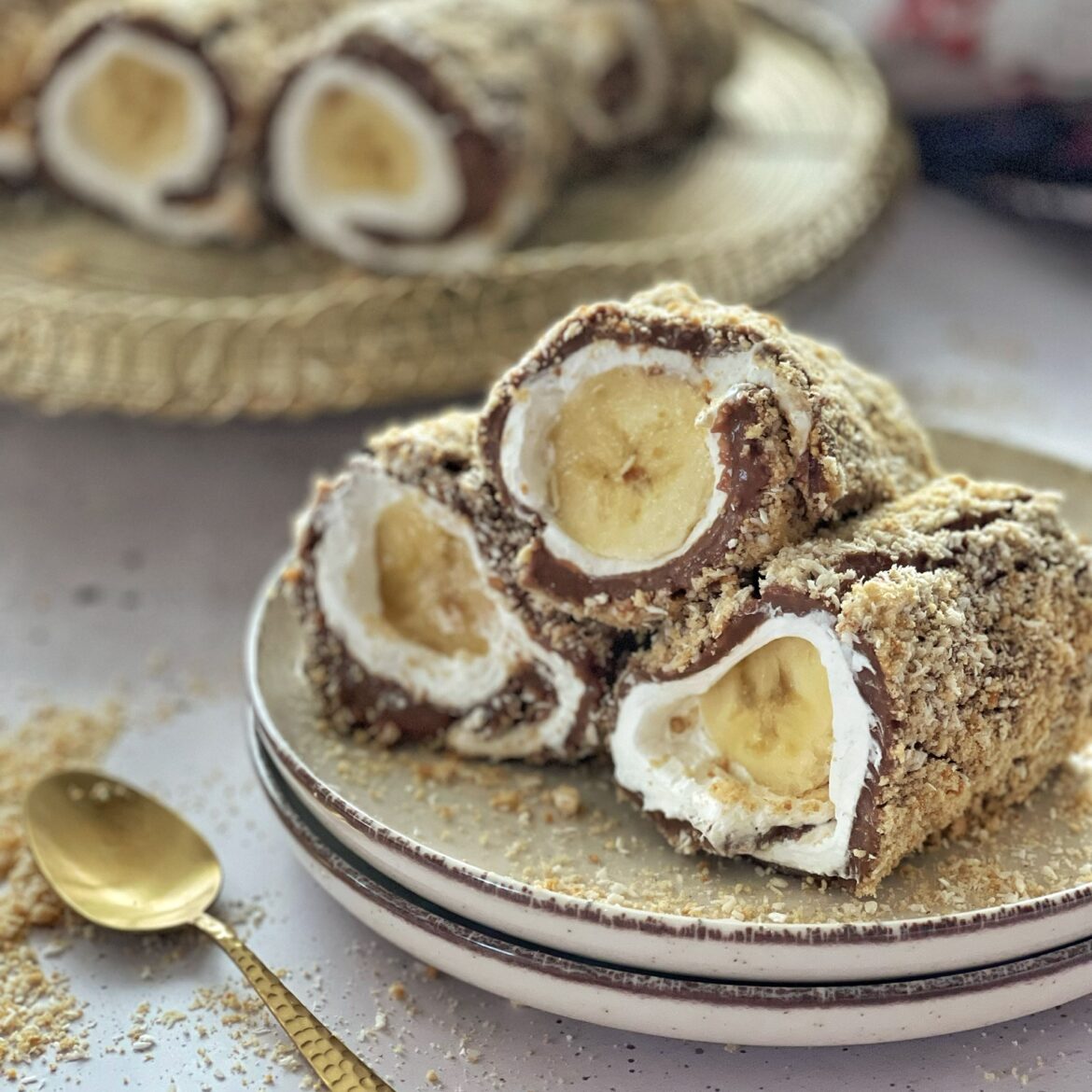 Umutite mikserom slatko vrhnje čvrsto. Nanesite na hladnu koru i stavite 1/2 banane. Rasjecite po dužoj strani na jednake trake i urolajte. Uživajte