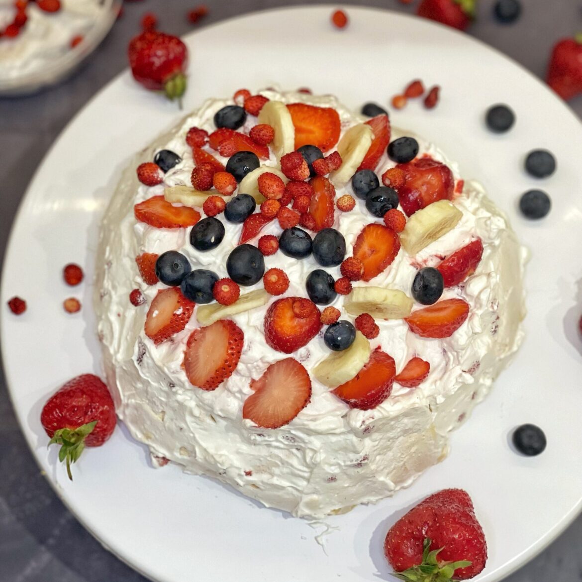 Za fil umutiti vrhnje i agavu te dodati jagode. Kada je izvadite napunite je sa filom, onaj gornji dio sam pukne pa fil ostane po vrhu torte. U principu nadjev se stavi samo na vrh ali ja ga volim po cijeloj torti tako da namažem sve, vi po želji. Dodajte voće po želji i uživajte. Ja sam ovdje posula malo istopljene čokolade.